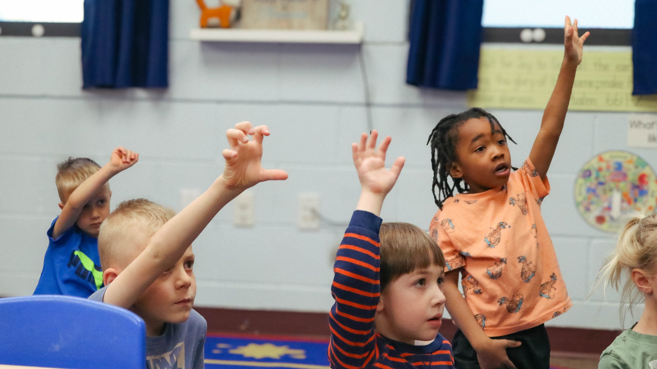 Center-spaced learning. Children sit at tables arranged in rows instead of desks and take part in hands-on activities that encourage intellectual curiosity and collaboration, such as arts and crafts and circle-time sing-alongs.